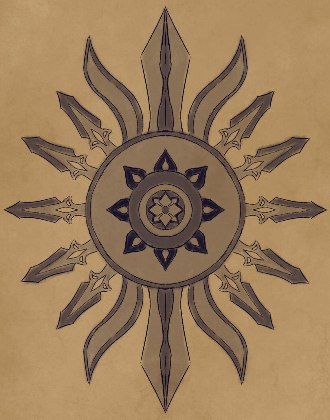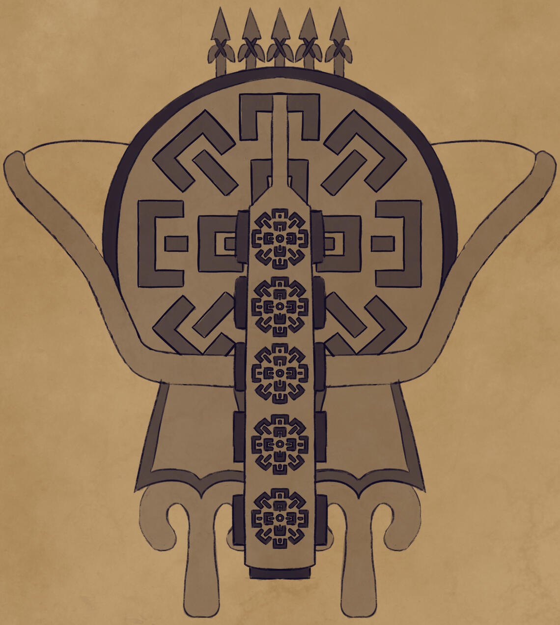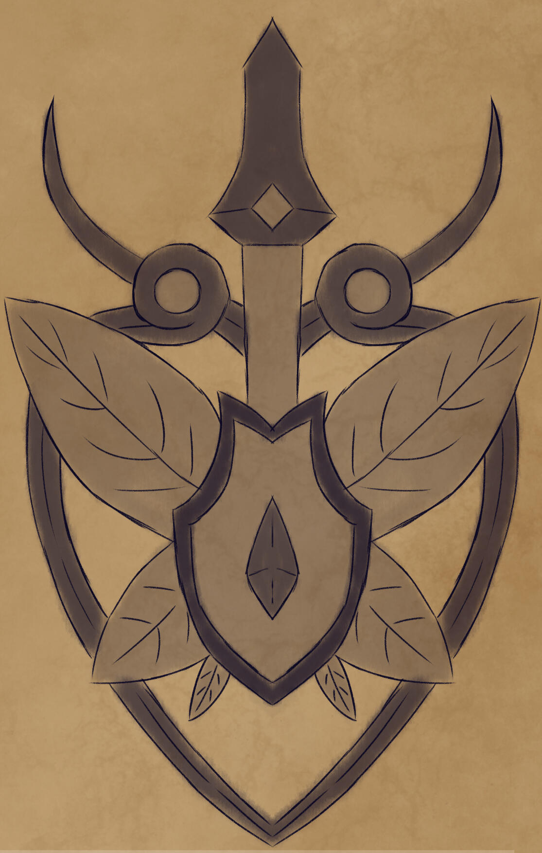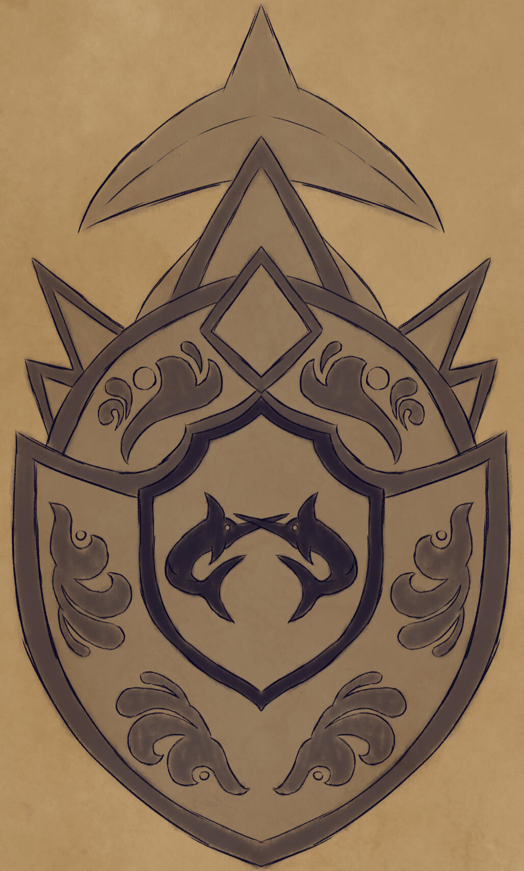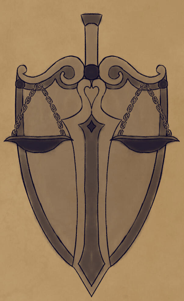 Roanne's seal is quite literally based on the shape of a horseshoe crab.There is detailing carved into seal to mimic waves of the water and two swordfish, a well-respected fish within the territory.While lacking in colors as it's primarily made of bronze, it's common to see pearls embedded into it and it's duplicates. Sometimes the pearls being more pinkish or blue in color instead of their lovely white.The original seal lies within an underwater cave that is primarily inaccessible by normal means. Though it's believed that there is way that the royal family can access.It's understood that it represents a shield while remaining sharp on its edges that can be used like an arm blade. In fact, Roanne uses the more basic shape of the seal to base their shields and arm-blades from.